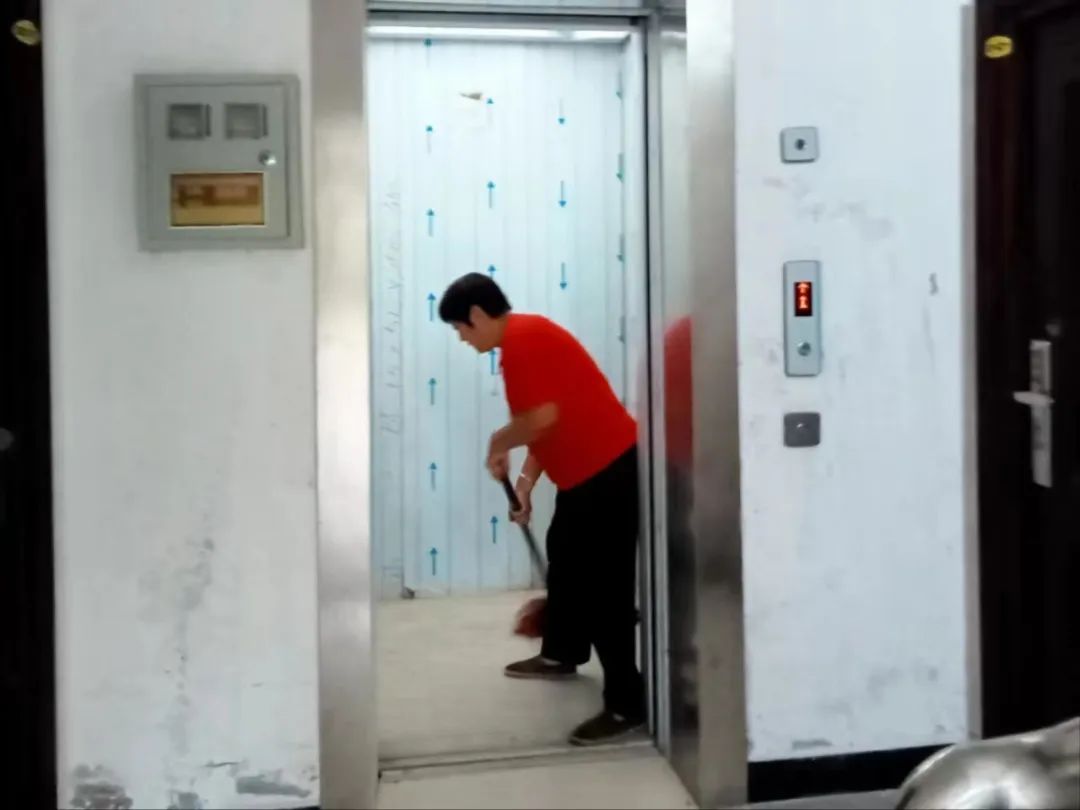 毓秀社区物业工作人员打扫社区楼道、楼梯等公共区域的卫生,营造良好的社区环境。