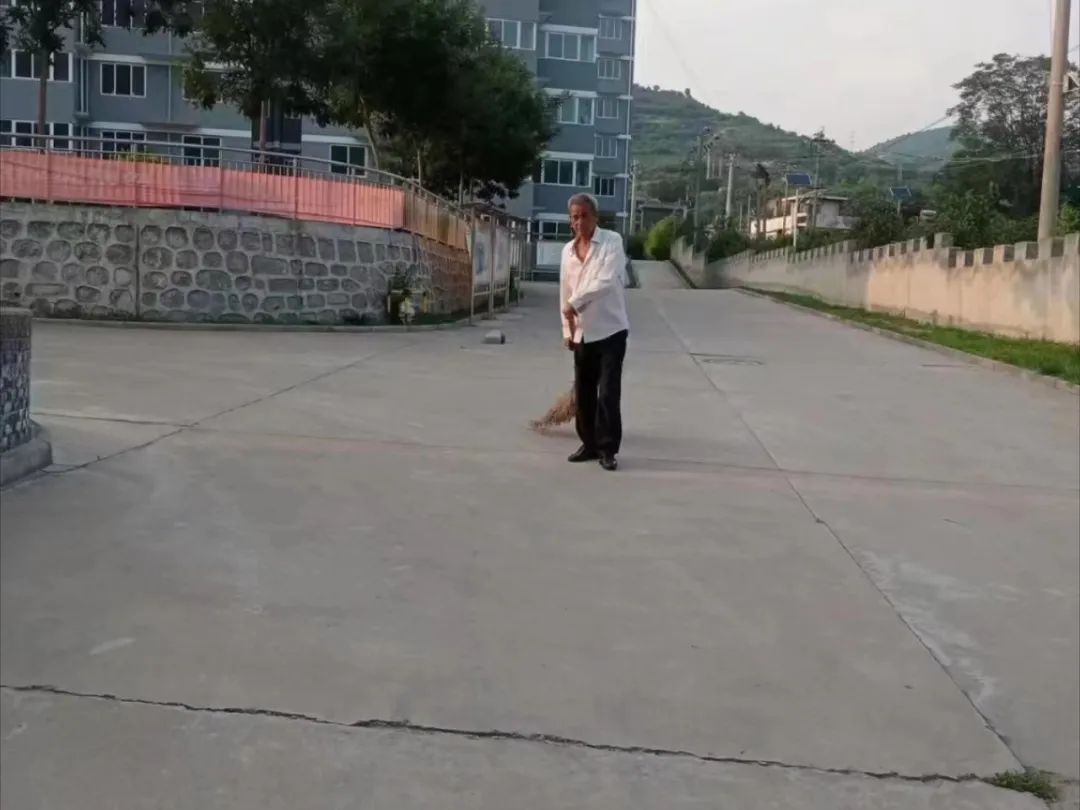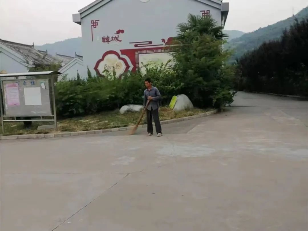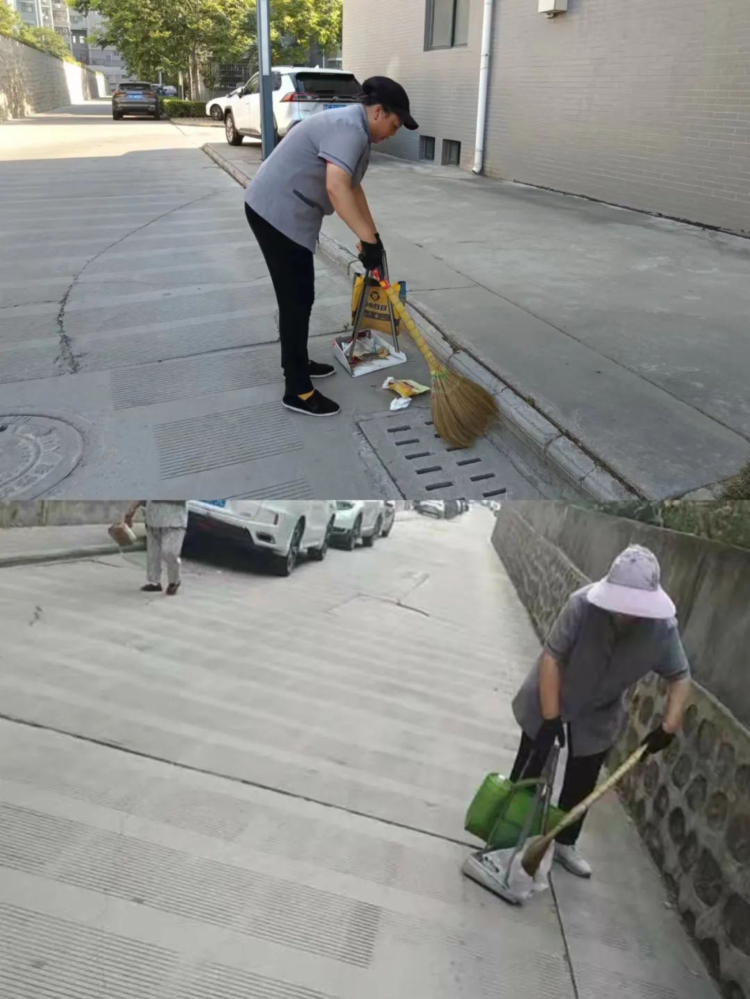 西川社区物业工作人员打扫社区公共区域的卫生,营造良好的社区环境。