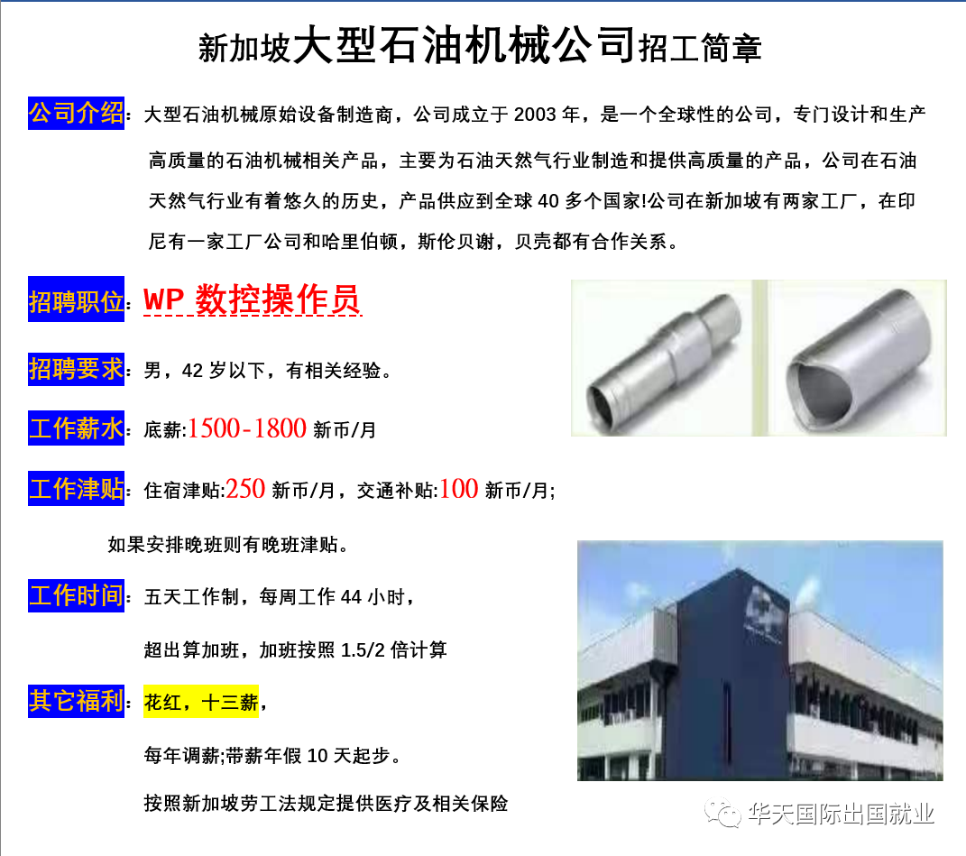 新加坡大型石油机械公司招聘数控操作员,男,42岁以下,有相关经验。