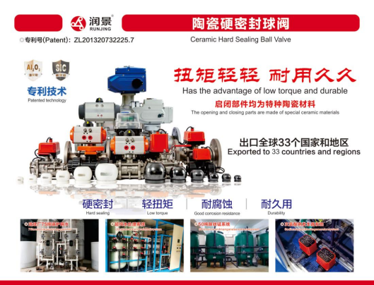 润景陶瓷硬密封球阀是润新公司从特种陶瓷平面密封到球面密封突破的技术成果(专利号:ZL201320732225.7),其过流部件采用刚玉陶瓷或碳化硅材料,经1680℃~2200℃超高温烧结、精密加工而成,具有“轻扭矩、耐腐蚀、耐磨损、耐久用”等特点,解决了传统阀使用过程中不耐用、水锤效应、水阻大、功耗大、不耐杂质等问题,已在能源、化工、印染、光伏、湿法冶炼、锂电池生产、海水淡化、生物制药、流体智能控制、污废水处理等领域应用多年,出口33个国家和地区。