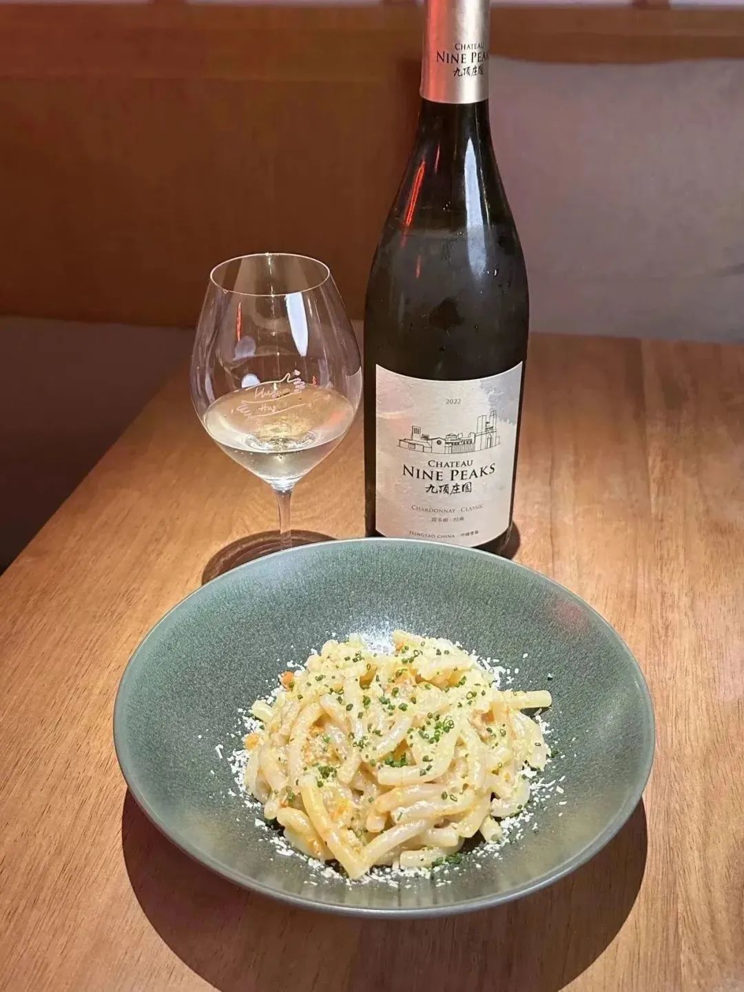 九顶庄园珍藏霞多丽2021,有明亮的稻草黄色,带有绿色调,有柑橘类水果的果香,橘皮、 白花和淡淡的奶油香气。口感圆润、馥郁,酸度适宜。