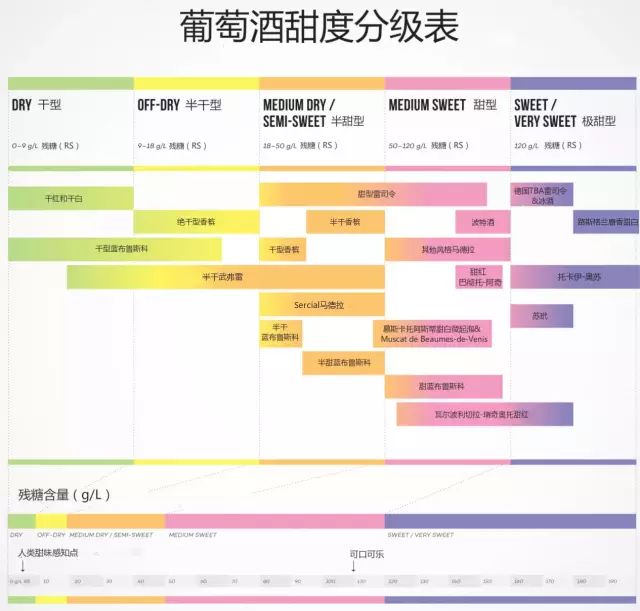 残糖(Residual Sugar,简称RS):在发酵过程中没有转化成酒精的果糖和葡萄糖在葡萄酒中的含量。残糖的常用单位是「克/升,g/L」,国际标准如下: