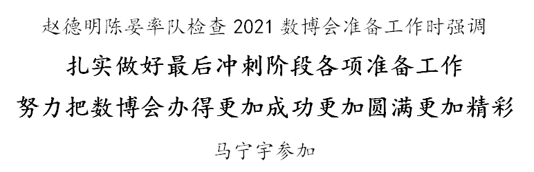 5月24日,省委常委、市委书记赵德明,省政协副主席、市委副书记、市长陈晏率队检查2021中国国际大数据产业博览会准备工作,强调要认真贯彻落实习近平总书记视察贵州重要讲话精神,把办好本届数博会作为勇当“抢新机”排头兵的重要举措,扎实做好最后冲刺阶段各项准备工作,努力把数博会办得更加成功更加圆满更加精彩。