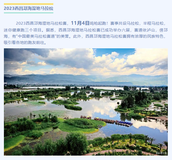 据波动体育消息,2023西昌邛海湿地马拉松赛将于11月4日鸣枪起跑!赛事共设马拉松,半程马拉松,迷你健康跑三个项目。据悉,西昌邛海湿地马拉松赛已成功举办六届,赛道依泸山,傍邛海,有“中国最美马拉松赛道”的美誉。此外,西昌邛海湿地马拉松赛拥有浓厚的民族特色,吸引着各地的跑友前往。