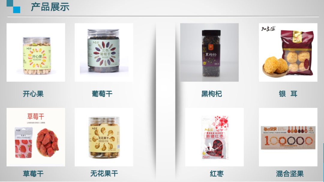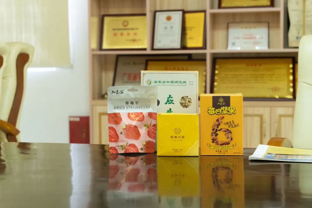渐渐潘家俊在食品行业闯下一片新天地,办公室里还有他写的一句话“一群人,一条心,一起拼,一定赢”。目前加良源拥有GAP源头种植基地,采用原有加工、研发、销售的发展模式。产品覆盖5大类别(水果干制品、代用茶、坚果炒货、养生汤料等),其50多个单品服务于高端零售业、国际贸易和电商平台及OEM生产。如广州酒家、山姆都是合作伙伴。