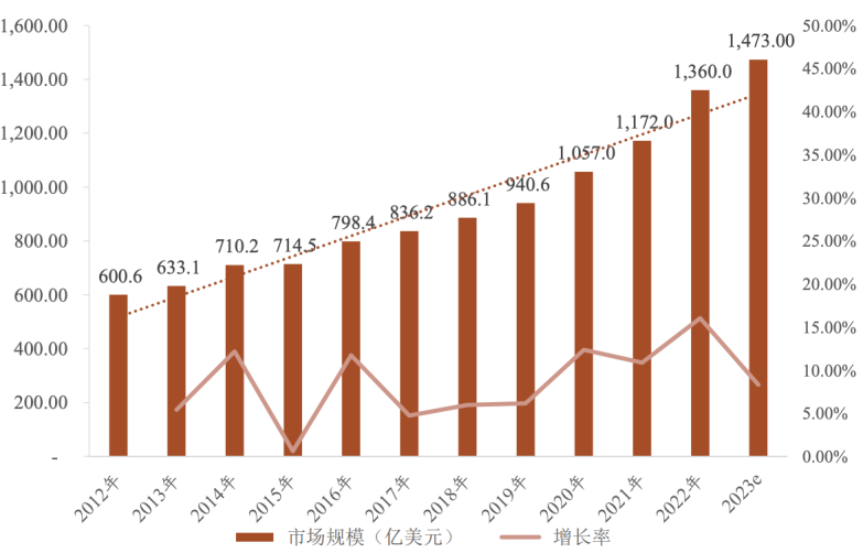 宠物食品市场是宠物行业最大的细分市场,也最先受益于宠物经济的发展,具有高复购、低价格敏感、强黏性的优势。据Statista数据,预计2023年全球宠物食品市场规模达到1473亿美元,2012年至2023年,全球宠物食品市场年均复合增长率约为8.50%,如下图所示。