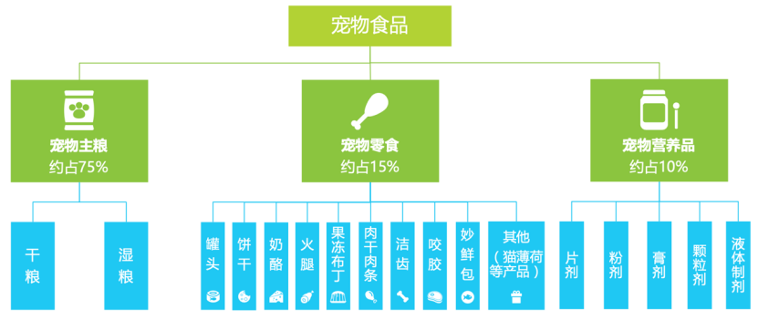 宠物食品以其形态、功能和营养成分可区分为宠物主食、零食及营养品。宠物主食(或主粮)是宠物最主要的食品,所含营养素和能量能满足犬猫每日全面营养需求。宠物零食通常是指能够补充单一或部分营养素但不追求全面平衡营养,人们为吸引宠物注意力、调节宠物口味、加深人宠之间感情、增强人宠互动、协助宠物训练所需要的产品。如冻干零食、烘干零食、风干零食、零食湿粮、咬胶、洁齿骨等。宠物营养品(保健品)为满足宠物各生命阶段及其生理需要而制作的营养补充剂,补充和强化单一或多种营养素,以利于宠物的健康发育和成长。宠物食品类别如下图所示。