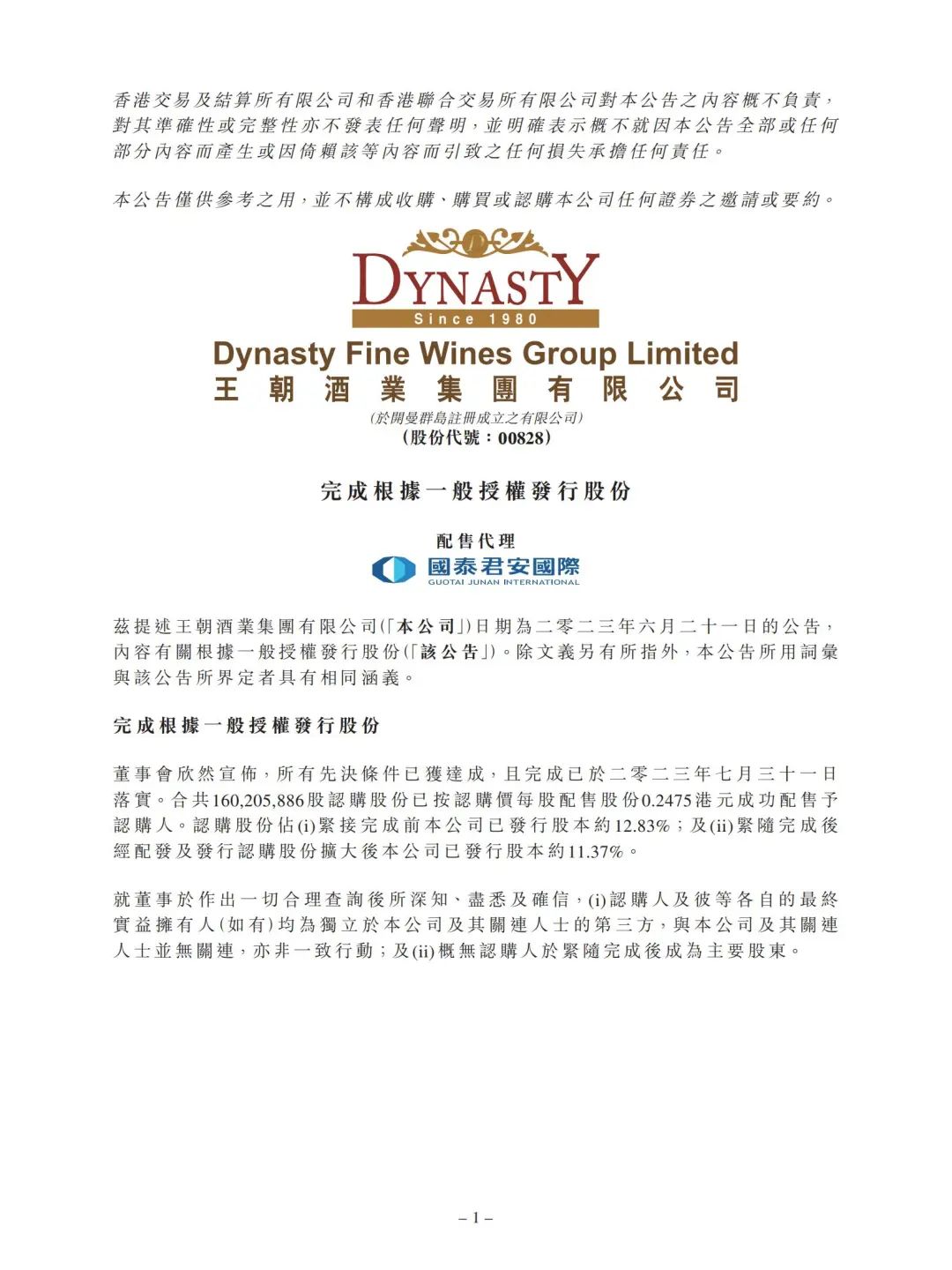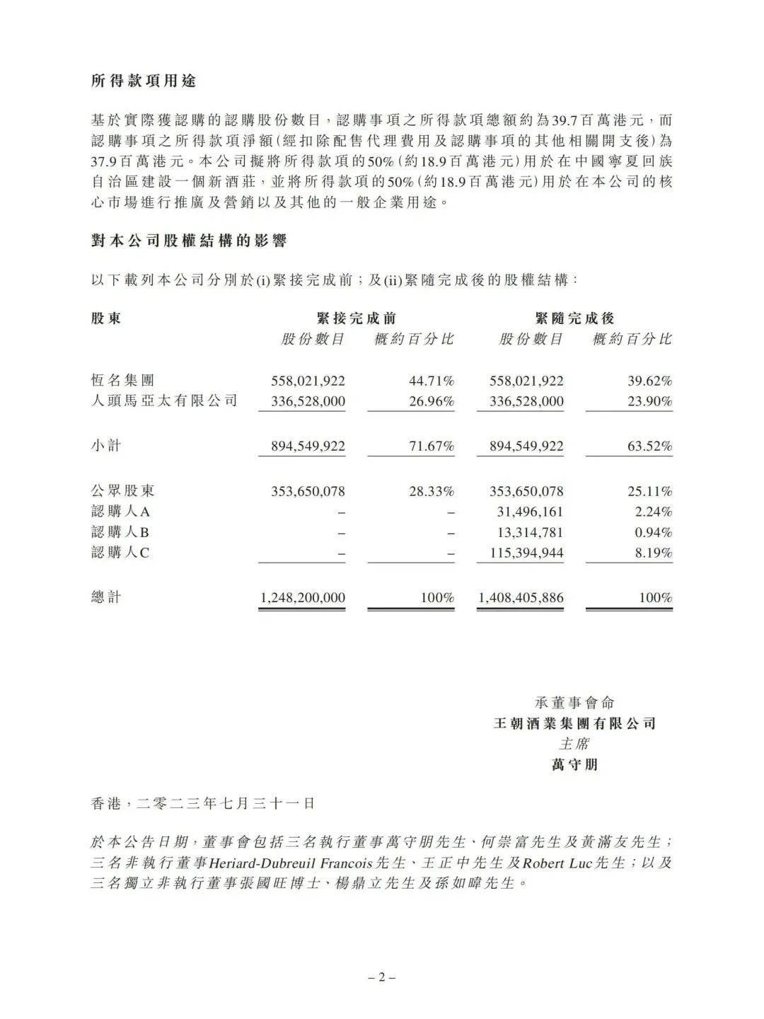 本次定向增发后王朝酒业总股本达到14.08亿股。其中,天津食品集团间接持股约5.58亿股,仍保持控股股东地位。王朝酒业将继续聚焦葡萄酒主业发展,坚持以市场为导向,以创新为动力,持续推进资本市场和产品市场同向发力,酿造具有”世界品质、中国风土、王朝味道“的葡萄酒,服务消费者美好生活。