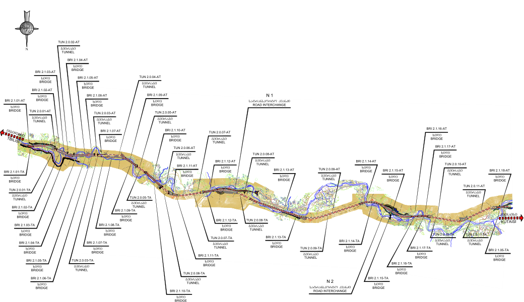 格鲁吉亚E60高速公路位于大小高加索山之间的Likhi山脉西麓,公路在山区和丘陵之间穿行,根据格鲁吉亚现行的地震灾害图和规范,项目所在地位于8级地震带(MSK64级),并处于山体滑坡的高风险范围。项目全长:TA(右幅)车道12.197km,AT(左幅)车道12.193km。项目桥隧比超过70%,主要工程内容包含主线桥梁35座,互通桥梁2座;隧道共计20条,单洞长度共计134.644m;涵洞35道,地下通道1道,通涵长1235.72m;挡土墙16道,全长1619m。