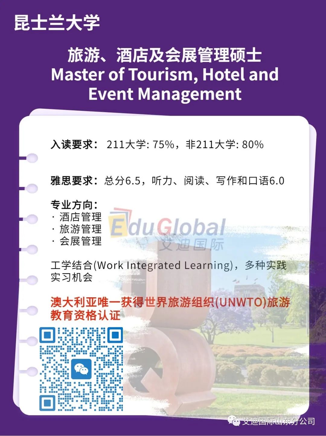 昆士兰大学是澳大利亚唯一一所获得联合国世界旅游组织(UNWTO)TedQual旅游教育认证的大学,提供整套课程。