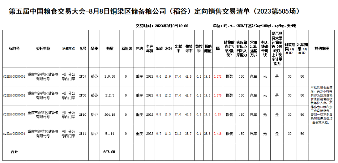 2. 产地、年限及数量:重庆2022年产稻谷687吨。