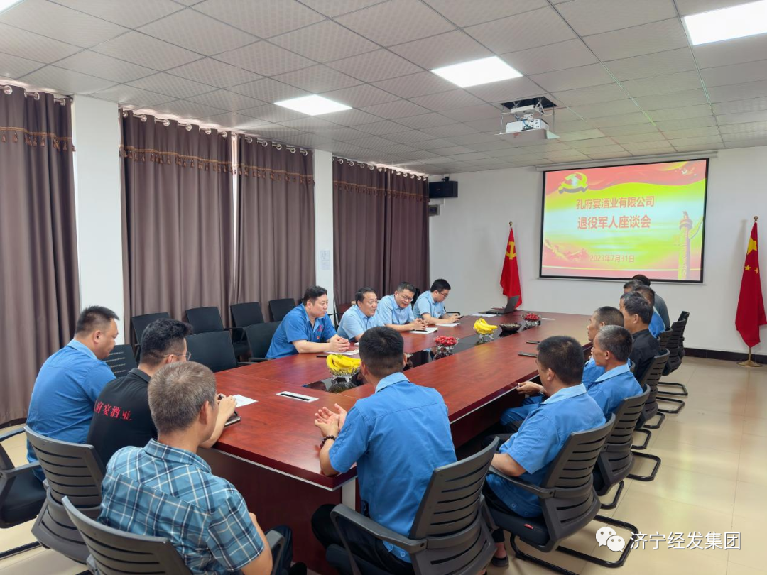为庆祝中国人民解放军建军96周年,深入了解和慰问退役军人工作和生活情况,7月31日下午,孔府宴酒业召开退役军人座谈会。会议由孔府宴酒业党支部副书记、工会主席黄余涛主持,济宁经发党委副书记、工会主席汪宗猛,孔府宴酒业党支部副书记、总经理李强出席会议并讲话。孔府宴酒业全体退役军人参加会议。
