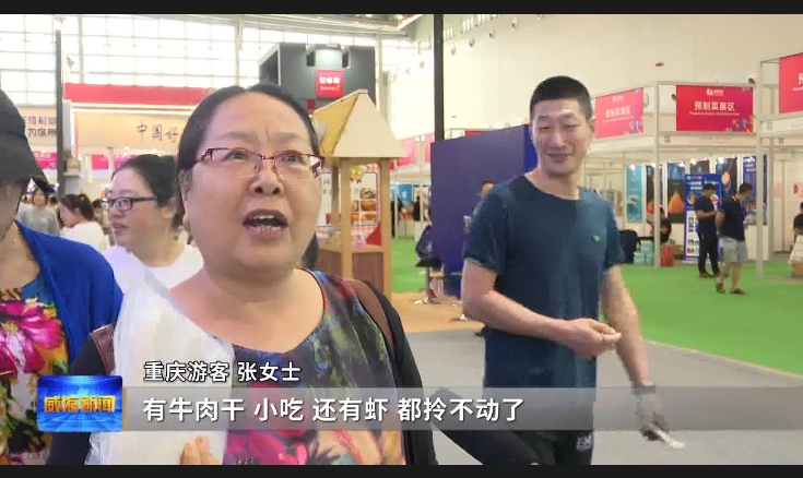 重庆游客张女士说,买了这么多,好丰富,有牛肉干、小吃,还有虾,都拎不动了。