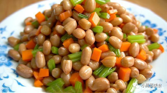 然后,我们把锅放在火上,开始煮熟花生。一旦花生煮熟,我们将它们捞出,并让它们冷却一会儿。接下来,我们需要准备胡萝卜和芹菜,把它们切成小丁。