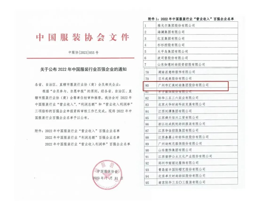 在7月31日,中国服装协会正式发布“2022年服装行业百强企业”名单。汇美集团以营业收入、营业收入利润率2项指标登上榜单。全国共有131家企业荣登2022年度的中国服装企业“百强”榜,其中:江苏39家、浙江25家、北京13家、而汇美集团作为广东仅有6家之一,有幸入选。