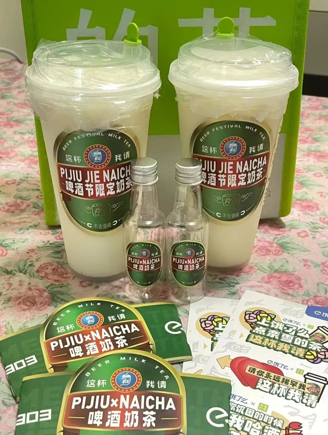 一向热衷于联名的奈雪的茶,近日和青岛啤酒节、饿了么联名推出了啤酒节限定款「栀子绿生椰奶茶套餐」以及包括青岛啤酒小酒瓶、青岛啤酒节主题贴纸、纸袋和杯套等限量啤酒节周边。本次联名设计以青岛啤酒标志性的绿色为主色调,带有鲜明的青岛地域印记。周边设计上,青岛啤酒小酒瓶复刻了瓶装青岛啤酒包装,仅在细节商标处用奶茶图标替换了青岛标志性地标栈桥,契合新茶饮与啤酒节跨界联动的主题。