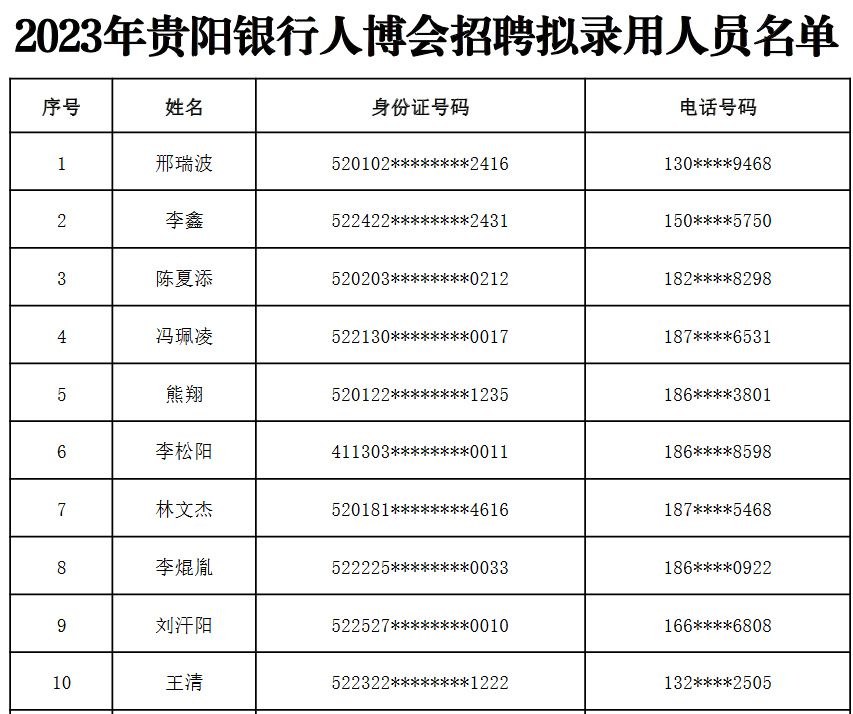 关于2023年贵阳银行人博会招聘拟录用人员的通知