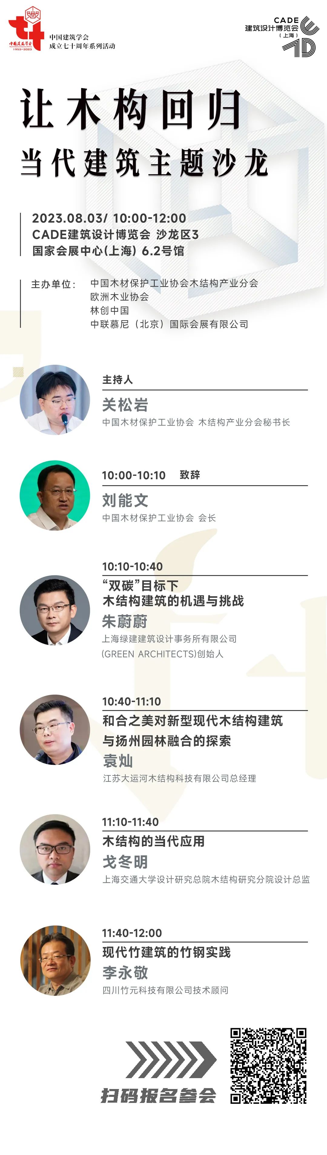 为落实“双碳”目标,让木结构融入当代建筑,由中国木材保护工业协会、欧洲木业协会、林创中国、CADE建筑设计博览会组委会-中联慕尼(北京)国际会展有限公司联合主办,定于2023年8月3日10:00 在在国家会展中心(上海)6.2号馆沙龙区3共同主办“让木构回归当代建筑”主题论坛沙龙。