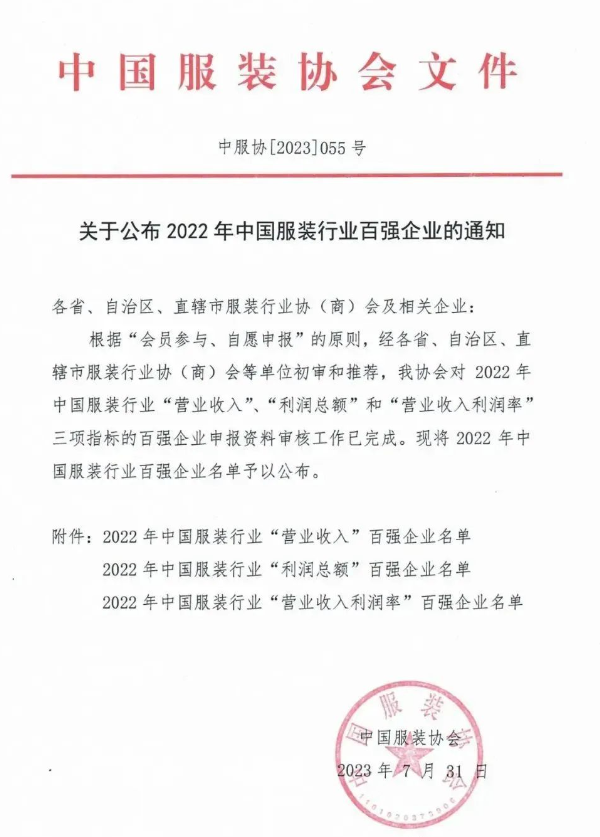 7月31日,中国服装协会正式发布“2022年服装行业百强企业”名单。