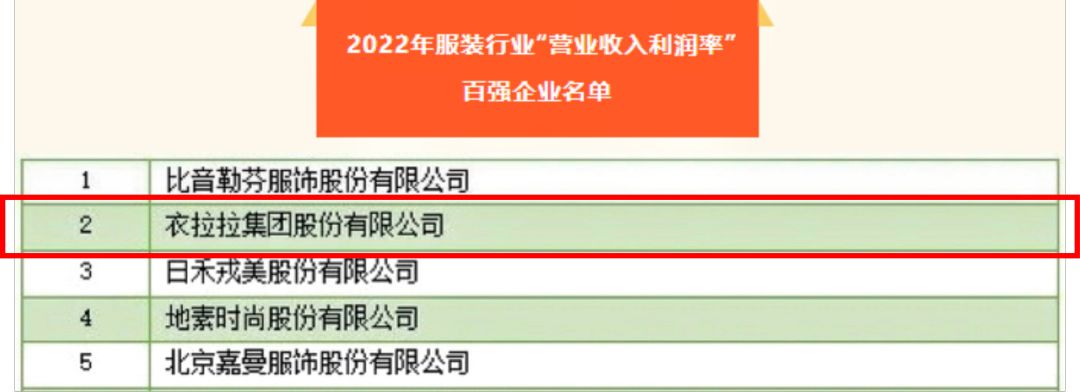 衣拉拉集团强势入选“2022年服装行业营业收入利润率百强企业”、“2022年中国服装行业利润总额百强企业”榜单,并凭借过硬实力在“2022年服装行业营业收入利润率百强企业”名单中排名全国第2位!