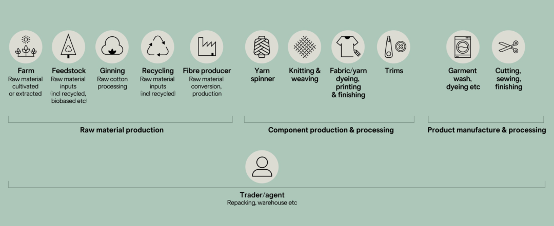 通常来说供应链包括了原材料采购、半成品生产,最终变为成品并通过分销网络将产品交付客户的过程。与食品生产或建筑材料制造不同,服装行业供应链冗长且复杂。纺织品和服装生产包括大量的加工环节,如纤维生产、纺纱、机织/针织、精加工、裁剪和缝纫,以及营销规划、批发/零售、购买和回收/处理等。