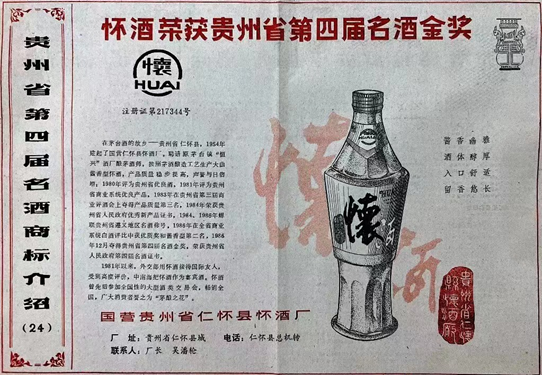 1951年,怀酒建厂,是贵州第一批国营酒厂。1954年初改名为国营仁怀县酒厂,1973年试制曲窖酒,聘请酱酒一代宗师李兴发指导工艺生产。怀酒凭借着上佳的品质,逐步成为贵州酱香酒的代表品牌,赢得“酒乡新秀,怀酒名扬四海”、“开怀畅饮”等美誉。特别是进入上世纪80年代,怀酒产品质量得到了越来越多的认可,从1986年,获得贵州省第四届名酒金奖,到1988年荣获国家商业部优秀产品金爵奖,再到1992年荣获香港国际食品博览会金奖等,荣誉不断。