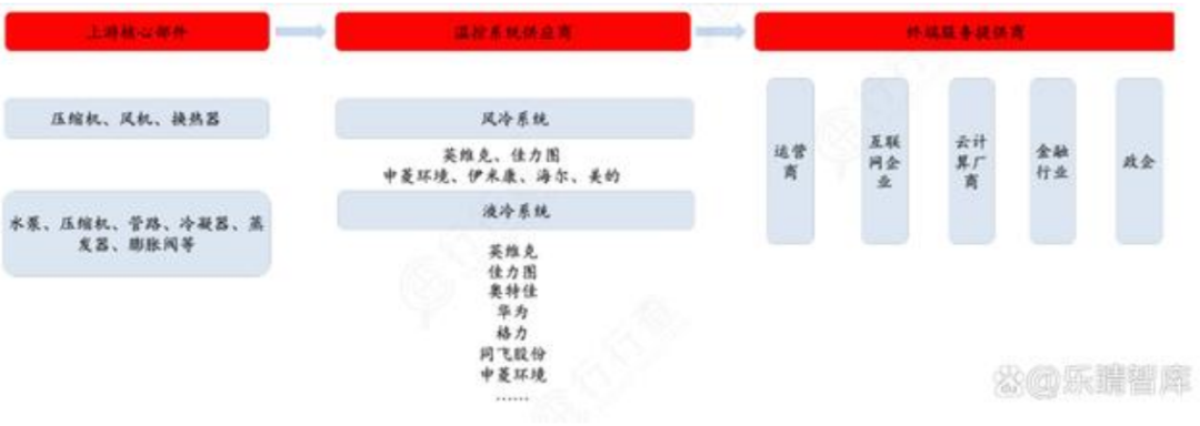行行查 | 行业研究数据库 资料显示,温控设备上游主要为核心零部件,包括压缩机、风机、水蒸发器等,上游厂商较为零散。中游主要为温控系统供应商,可分为风冷系统与水冷系统。下游主要聚焦于运营商、互联网、云计算、金融等行业。数据中心的温控便处于温控行业的下游产业链中,是应用温控技术的实地场景。