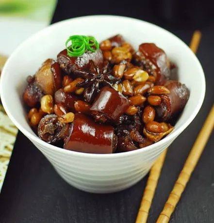 食材:猪尾巴1条、黄酒适量、红衣花生适量、红酒适量、八角适量