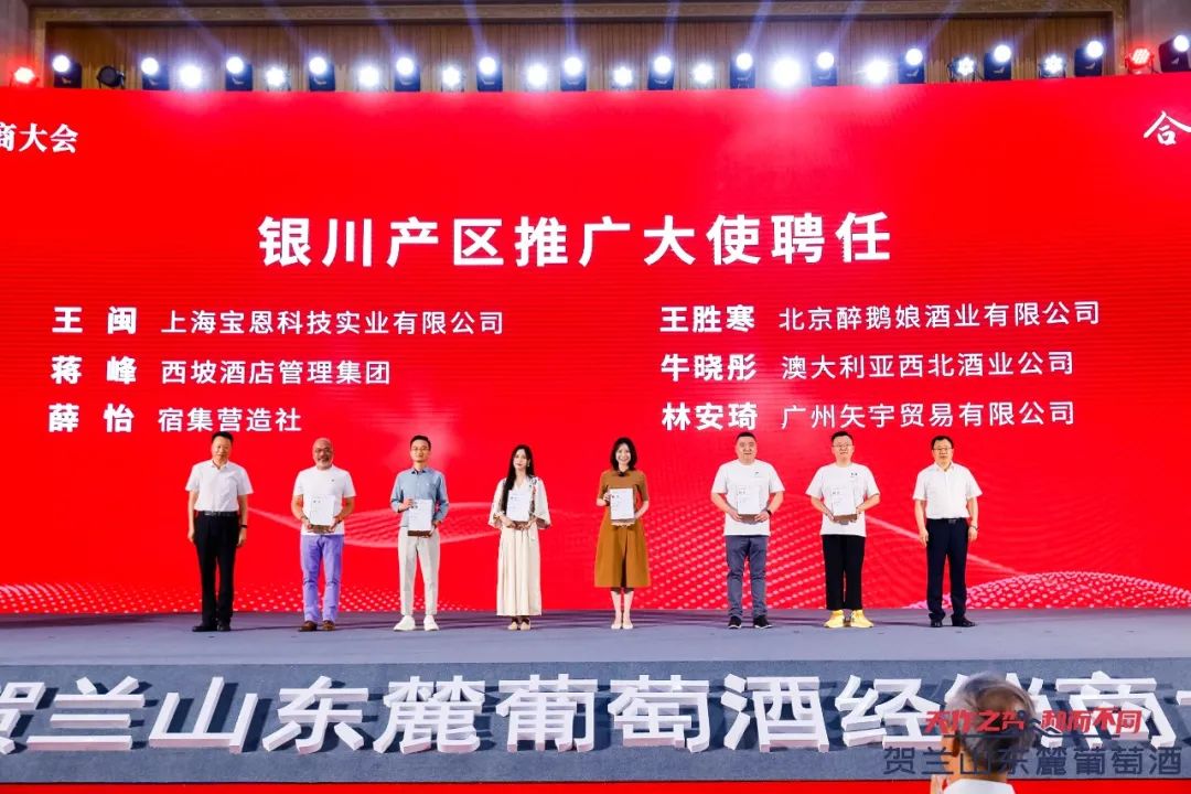 经销商大会上,贺兰山东麓葡萄酒银川产区隆重聘任了八位杰出人士为推广大使,包括上海宝恩科技实业有限公司董事长王闽、西坡酒店管理集团市场销售总监蒋峰、宿集营造社COO薛怡、澳大利亚西北酒业公司总经理牛晓彤、广州矢宇贸易有限公司总经理林安琦、北京醉鹅娘酒业有限公司创始人兼CEO王胜寒、京东零售大商超事业部酒类业务部总经理赵煜、京东零售大商超事业部葡萄酒采销负责人肖诺。这八位推广大使将成为贺兰山东麓葡萄酒银川产区的代言人,共同致力于将银川的葡萄酒文化传播到更广泛的群体,推动产区的创新发展。