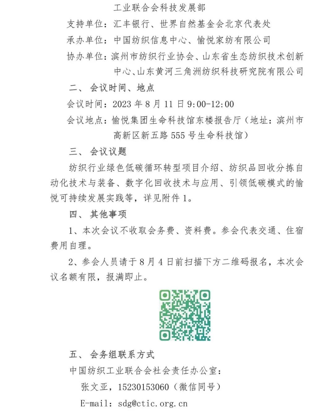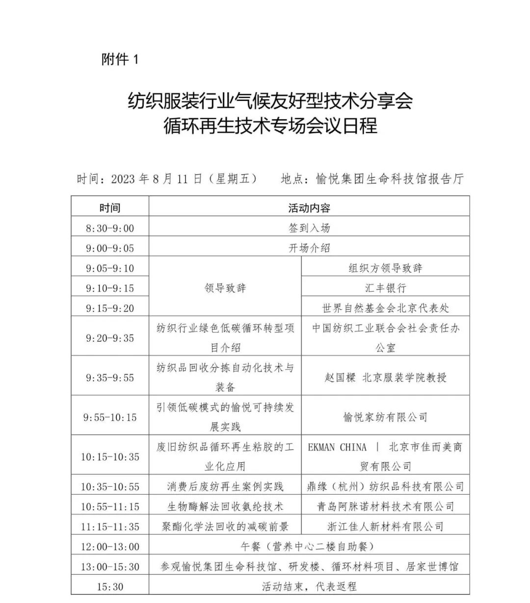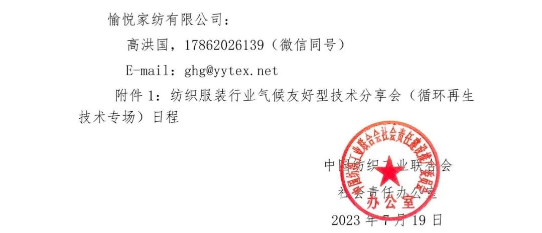2022年中国纺织工业联合会社会责任办公室在中国纺织信息中心、中国纺织工业联合会科技发展部联合开展气候友好型技术推广、转化开展线下交流对接活动。2023年开始举办气候友好型技术分享会,分享先进实用的创新技术、工程案例和解决方案。共同探索废旧纺织品循环利用的有效途径,推动纺织行业可持续发展。2023年8月11日,将在山东滨州举办循环再生技术专场,将围绕“纺织品回收、分拣和再利用的技术及解决方案”等角度开展交流。