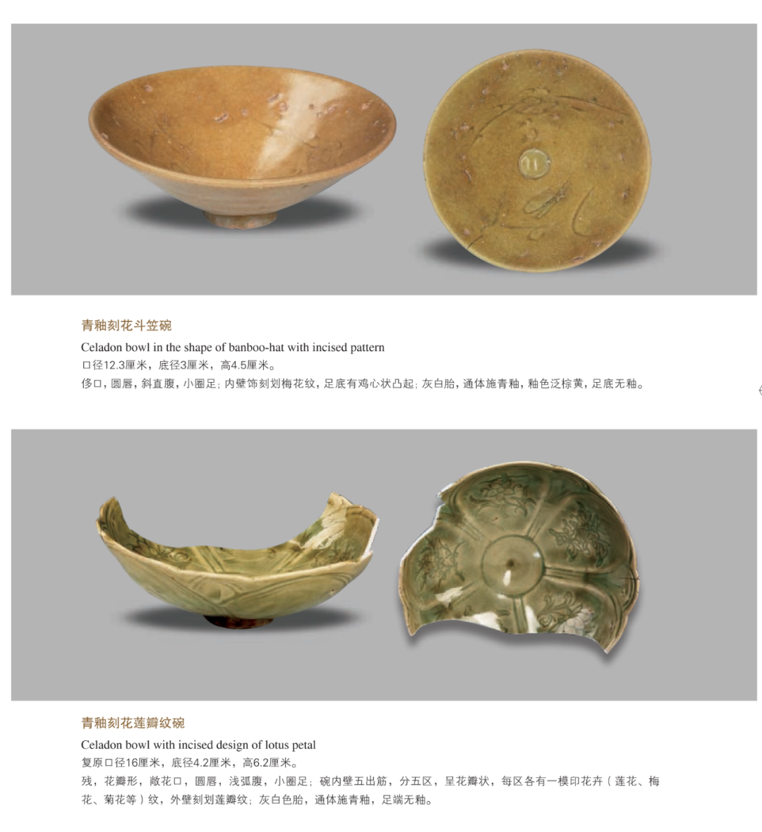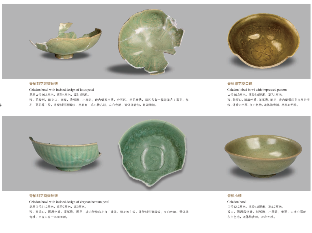 龙泉窑窑址主要分布在浙江省南部到福建省北部,因其主要产区在浙江省西南部龙泉市境内而得名,窑址数量已达500余处。其创烧年代可以追溯至五代宋初,鼎盛于南宋至明早期,明代中期以后逐渐衰落,清晚期最终退出历史舞台。其产品畅销于亚洲、非洲、欧洲的众多国家和地区,是海外贸易的重要参与者。樊村泾元代遗址出土150余吨龙泉青瓷器,时代集中于元代中晚期,主要器形有碗、盘、盏、杯、洗、高足杯、炉、瓶、荷叶罐等数十类,装饰技法上有刻花、印花、贴花、点彩等,纹饰题材丰富,有云龙纹、飞凤纹、花卉纹、杂宝纹等,另有大量汉文和八思巴文款铭。