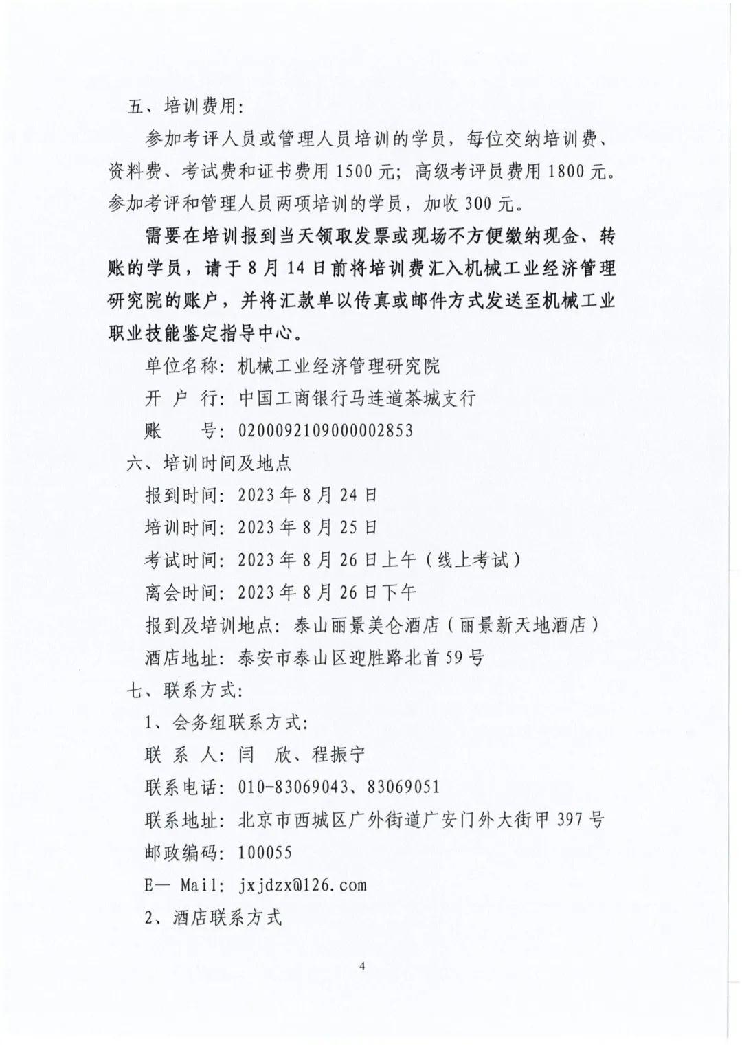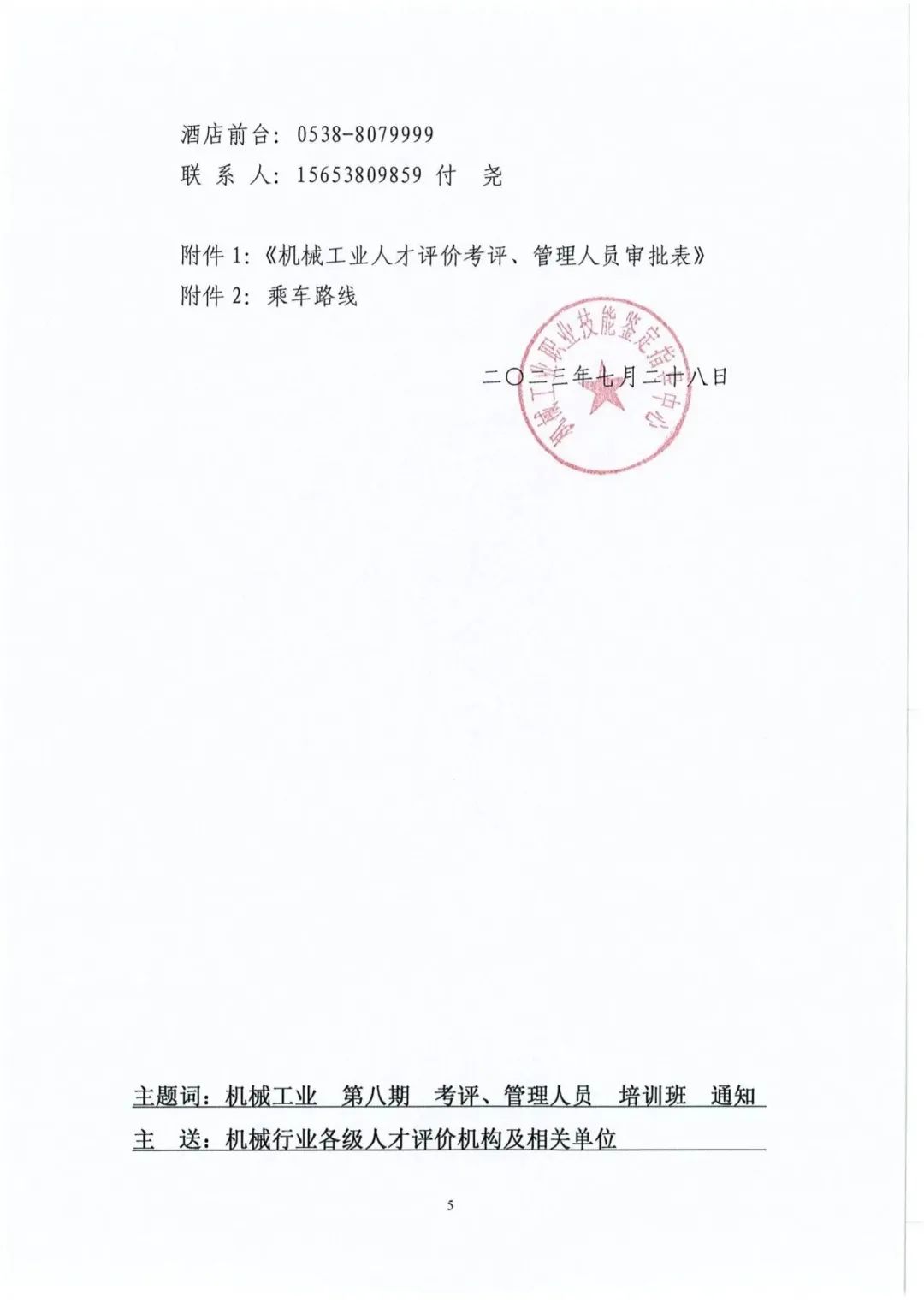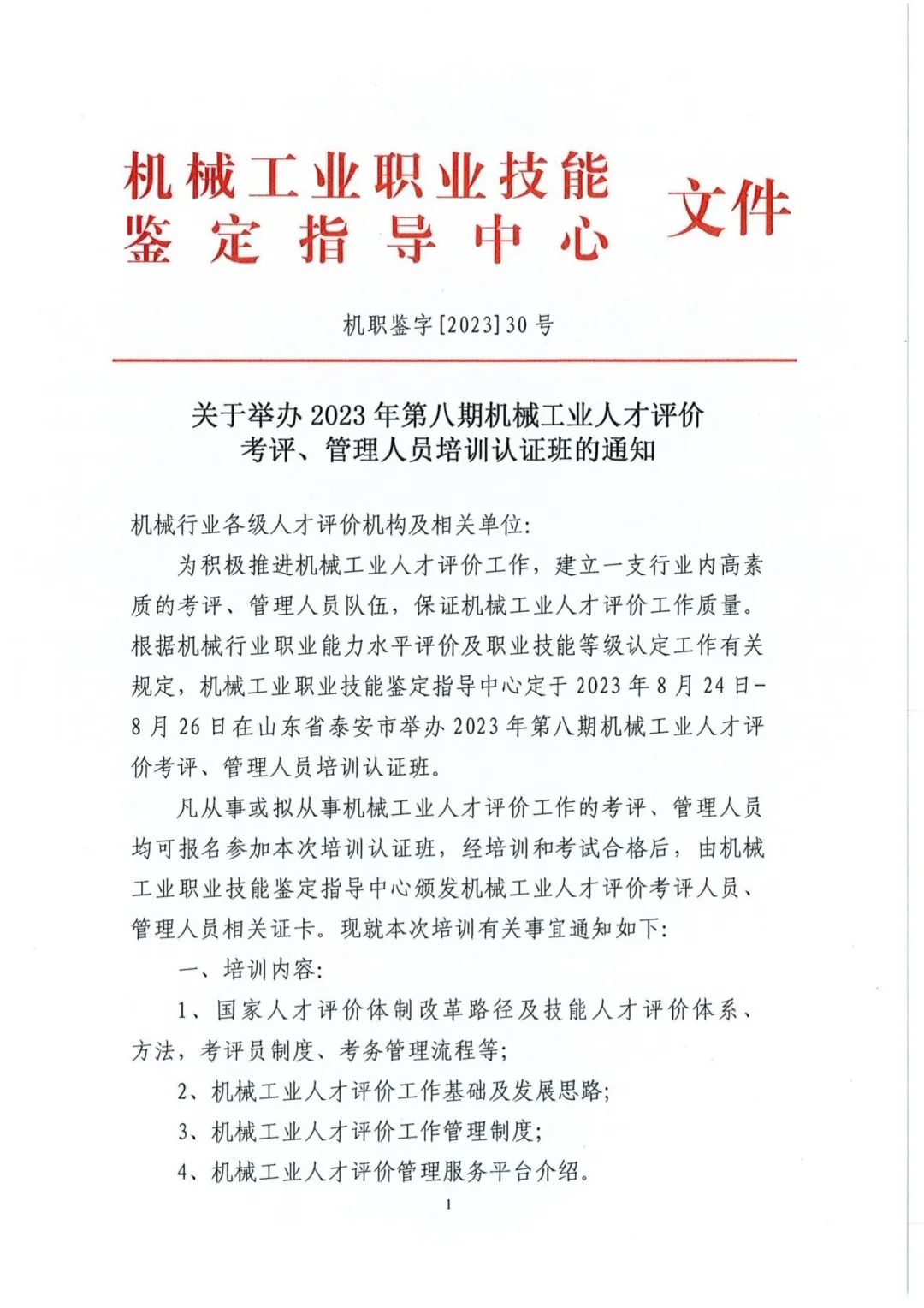 为积极推进机械工业人才评价工作,建立一支行业内高素质的考评、管理人员队伍,保证机械工业人才评价工作质量。根据机械行业职业能力水平评价及职业技能等级认定工作有关规定,机械工业职业技能鉴定指导中心定于2023年8月24日-8月26日在山东省泰安市举办2023年第八期机械工业人才评