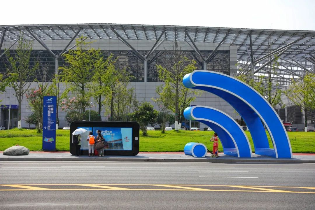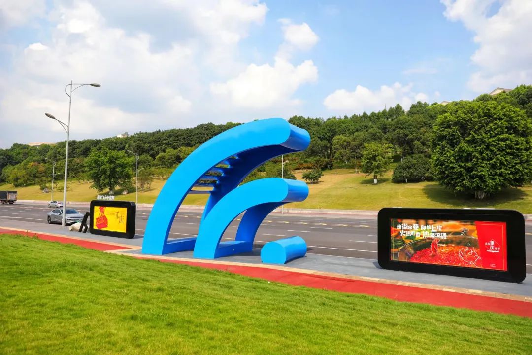 艺术公交车站《新世界》位于悦来大道,车站以“WIFI”符号作为创作元素,将其平面化的图像实体化后构筑成一个围合的空间。两侧广告灯箱同样也采用一体化设计将手机等电子设备的平面化符号转换为立体的造型,中间穿插着各种彩色的剪影小人,以一种日常的生活状态聚集在WiFi的周围,它们与公众在参与中对话,不断提醒着我们正身处当下这互联网时代下,快乐并警惕地“共享”着新世界所带来的惊喜与挑战。