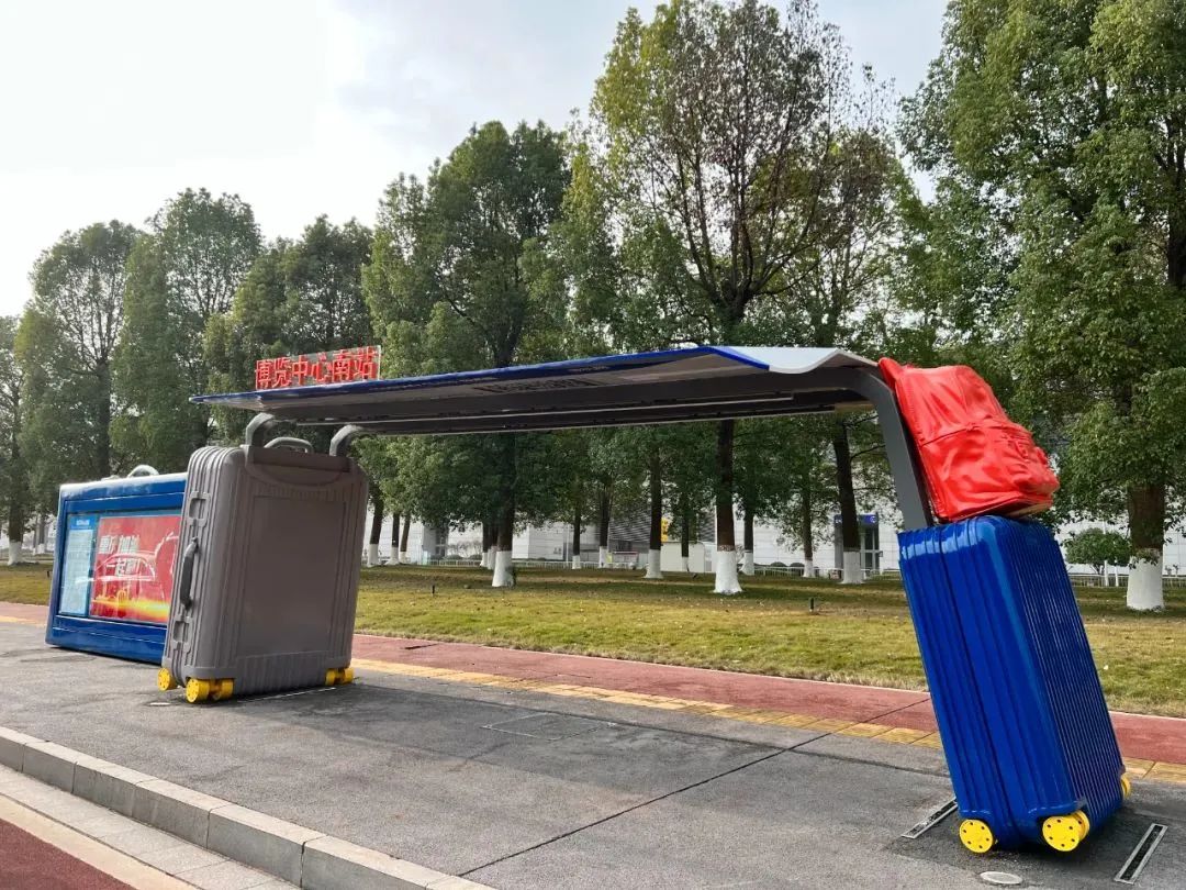 博览中心南站《行囊》,结合公交站的使用功能,采用超现实主义的创作手法塑造了两个巨大的行李箱和一张登机牌,体现了悦来国际会展城“近者悦、远者来”的精神。