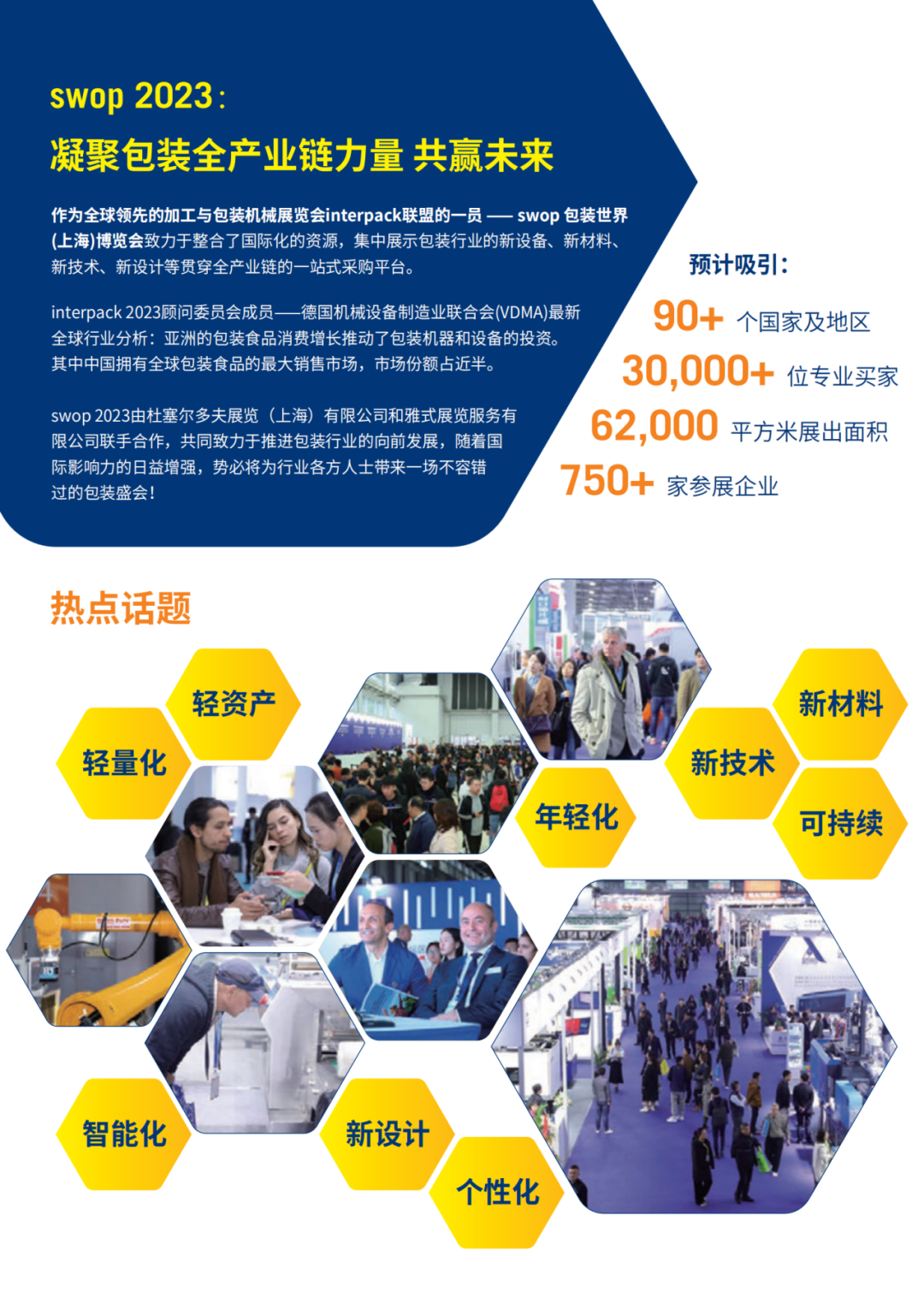 swop 包装世界(上海)博览会将于2023年11月22-24日在上海浦东新国际博览中心举办。作为interpack联盟成员展,swop 除了继续展出包装全产业链外,更会与包装人、品牌商、OEM/ODM代工厂共同探讨行业热门关键字,包括轻量化、轻资产、年轻化、智能化、个性化、新材料、新技术、可持续、新设计风潮等热门课题,分享包装前沿理念及技术。