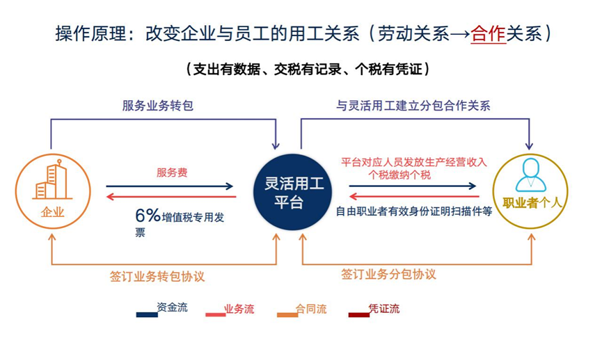 在业务合作的基础上,灵工平台与企业签订综合服务协议,并与自由职业者签署相应的电子服务合同。自由职业者在线接单,由平台发放自由职业者的经营所得,统一申报个税,并由平台为企业提供完整的结算及票税凭证。