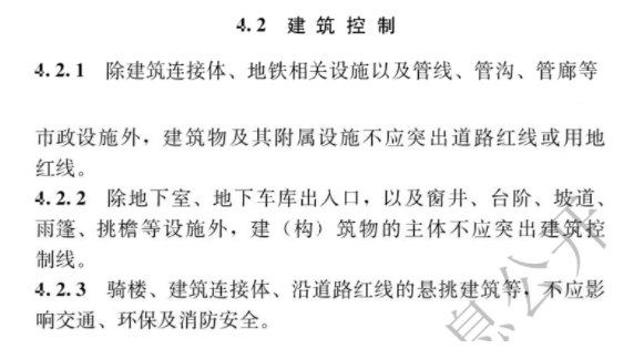 4.2.1 除建筑连接体、地铁相关设施以及管线、管沟、管廊等市政设施外,建筑物及其附属设施不应突出道路红线或用地红线。