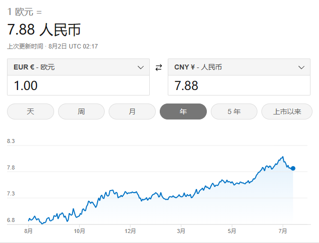 其中,美元呈现的是明显的波浪式上下浮动,1美元兑人民币在6.7-7.3元之间;而欧元则呈现的是明显的大幅上涨,从一年前的1欧元兑6.8元人民币,快速上浮至最高破8元。
