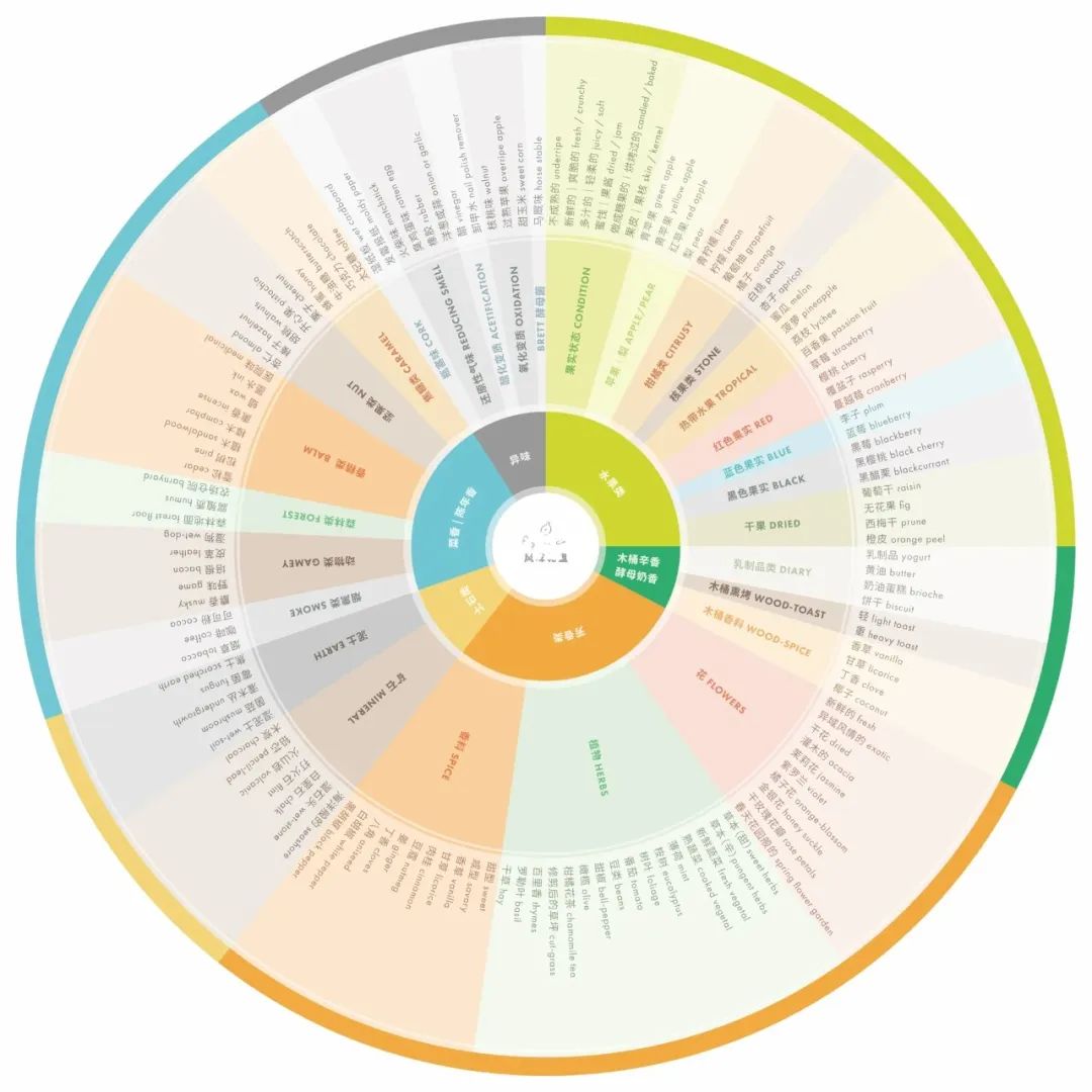现在,有一种表格可以帮助我们看着学会分辨和表达香气,它就是——葡萄酒香气轮盘。