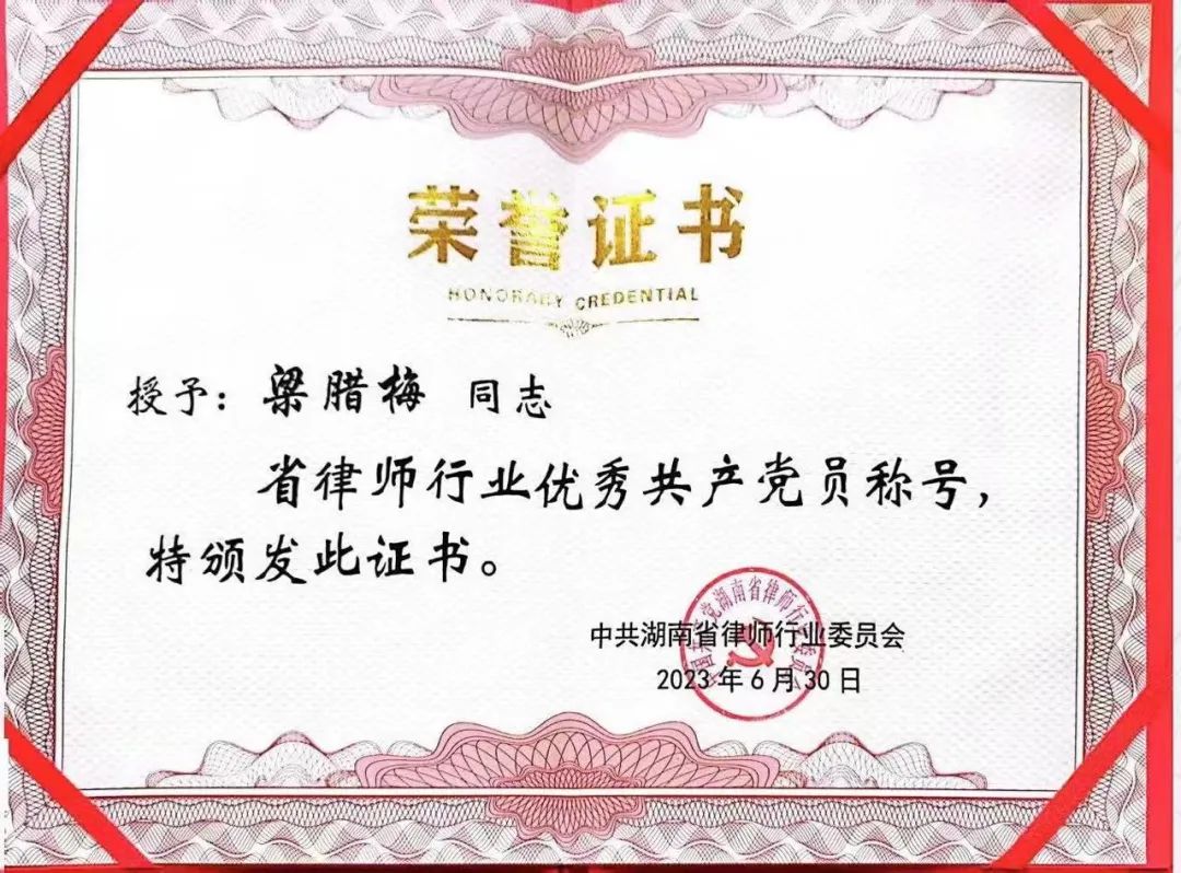 为庆祝中国共产党成立102周年,鼓励先进,表扬典型,湖南省律师行业党委开展全省律师行业“先进基层党组织、优秀共产党员、优秀党务工作者”评选表彰活动,共评选出先进基层党组织1名,优秀共产党员4名,优秀党务工作者1名。本所高级合伙人梁腊梅律师获评为“优秀共产党员”。
