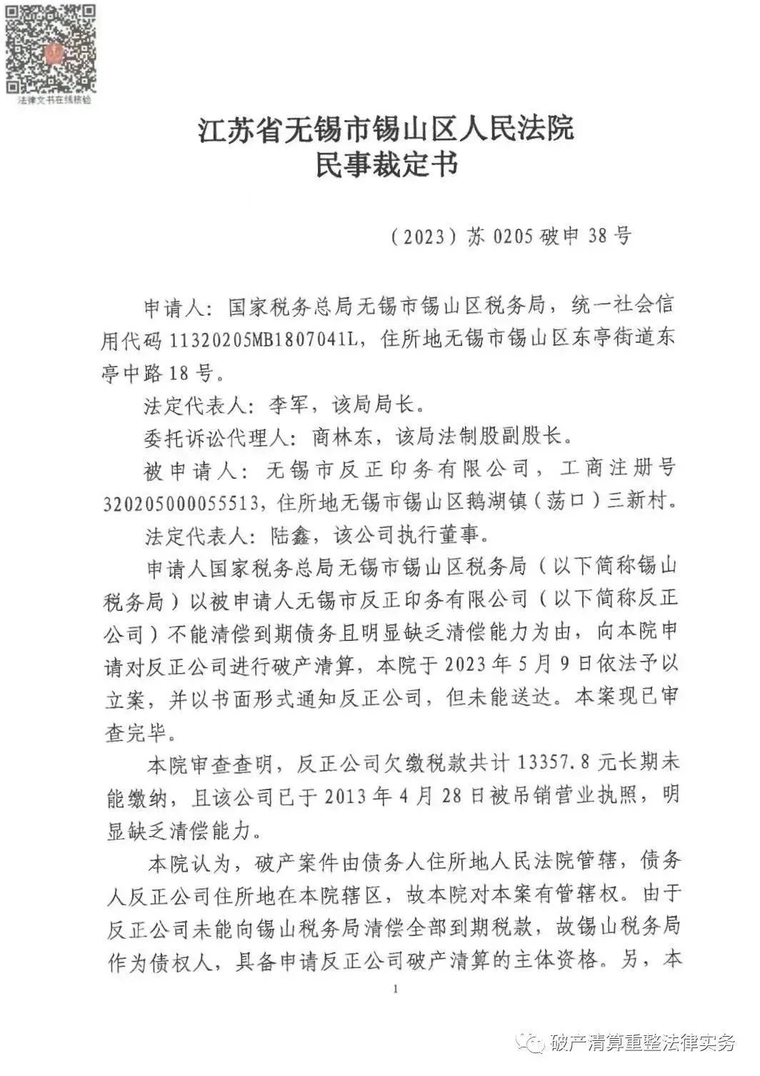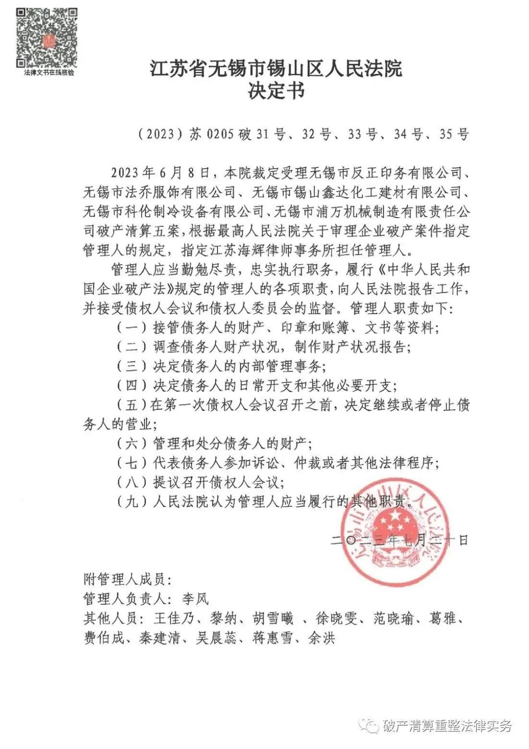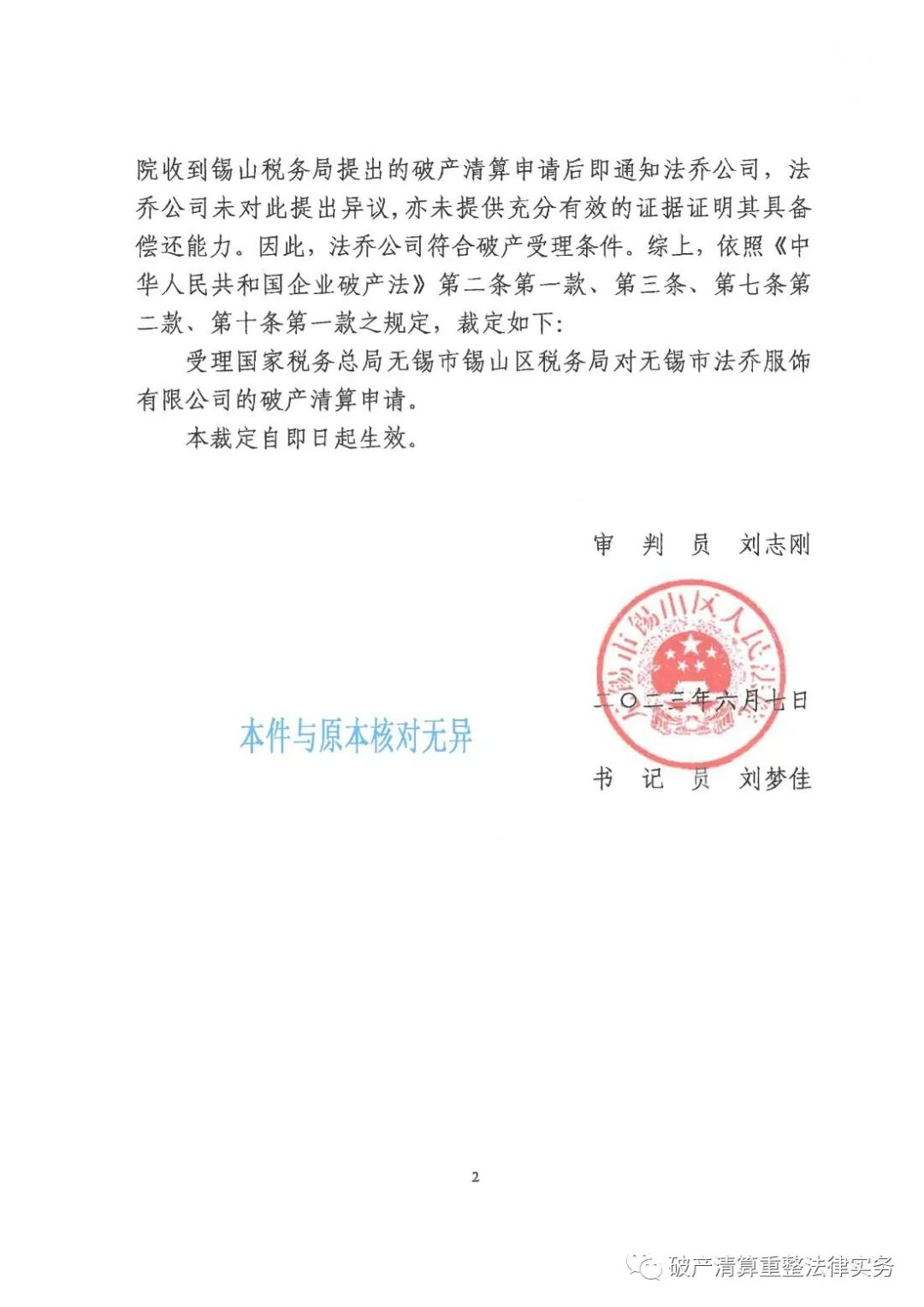 国家税务总局无锡市锡山区税务局以无锡市法乔服饰有限公司不能清偿到期债务,且明显缺乏清偿能力为由,向江苏省无锡市锡山区人民法院申请对无锡市法乔服饰有限公司进行破产清算。江苏省无锡市锡山区人民法院审查后,于2023年6月7日作出(2023)苏0205破申39号《民事裁定书》,裁定受理国家税务总局无锡市锡山区税务局对无锡市法乔服饰有限公司的破产清算申请,并于2023年7月20日作出(2023)苏0205破32号《决定书》,指定江苏海辉律师事务所担任无锡市法乔服饰有限公司管理人。