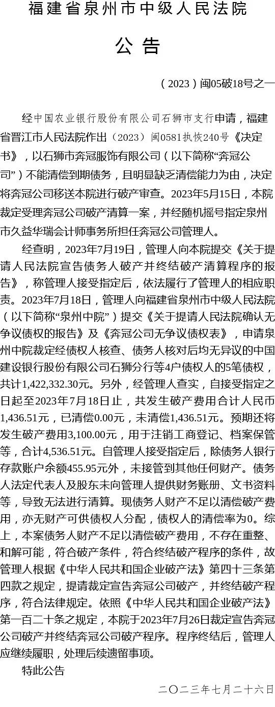 宣告石狮市奔冠服饰有限公司破产并终结破产程序