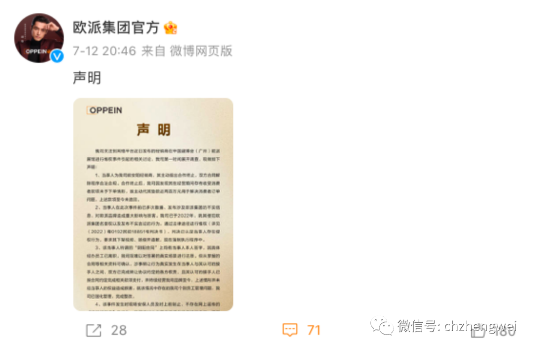 欧派官方微博声明https://weibo.com/2037267967/N9yDYmeJ5#comment