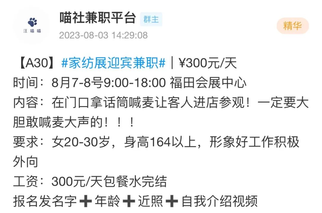 另:若在兼职活动合作的过程中,遇到任何押金索取/服装费用/恶意克扣工资/恶意拖欠工资等任何活动方违规行为,均可在深圳喵社-曝光举报栏发布处理(不可涉及个人隐私)