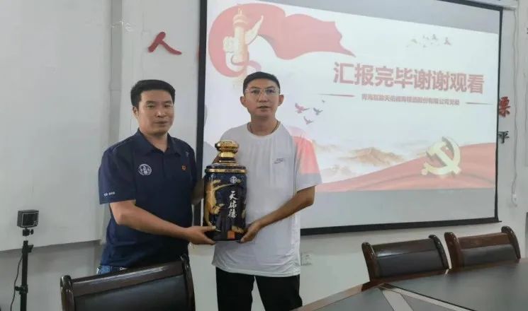 会议最后,天佑德青稞酒公司与青海翠如蓝城市环境服务有限公司进行了赠酒仪式。