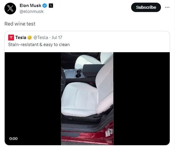 近日,伊隆·马斯克在其社交平台上转发了特斯拉官方发布的视频,视频记录了在特斯拉座椅上进行的红酒渍清洁测试,同时特斯拉官方还表示,“大多数污垢只需用温水和超细纤维布就可以擦掉。”
