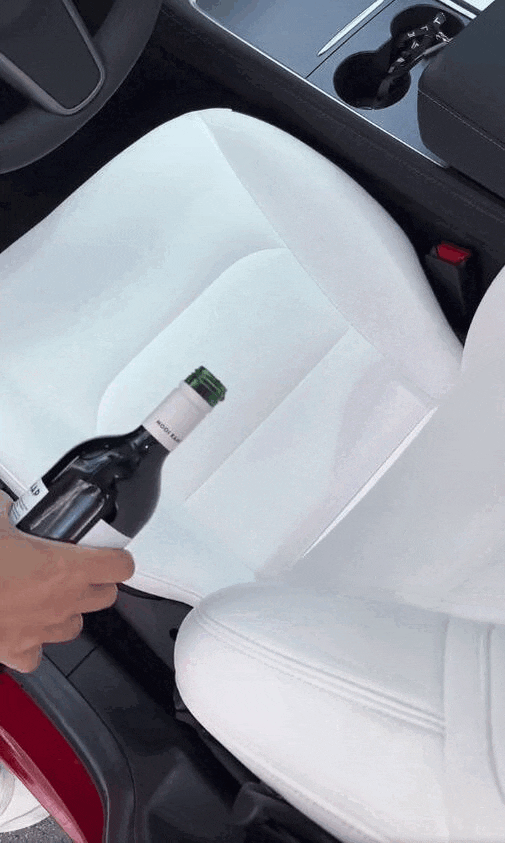 汽车的白色内饰本身就需要格外呵护,上保养剂、皮面清洗抛光都是常规操作,倘若不幸遇上了气味浓郁、且具有染色性的红酒,怕是要里里外外来个彻底大保养。然而特斯拉的超白纯素皮革座椅在推出之际,就打出了清洁性和防污特性的宣传。
