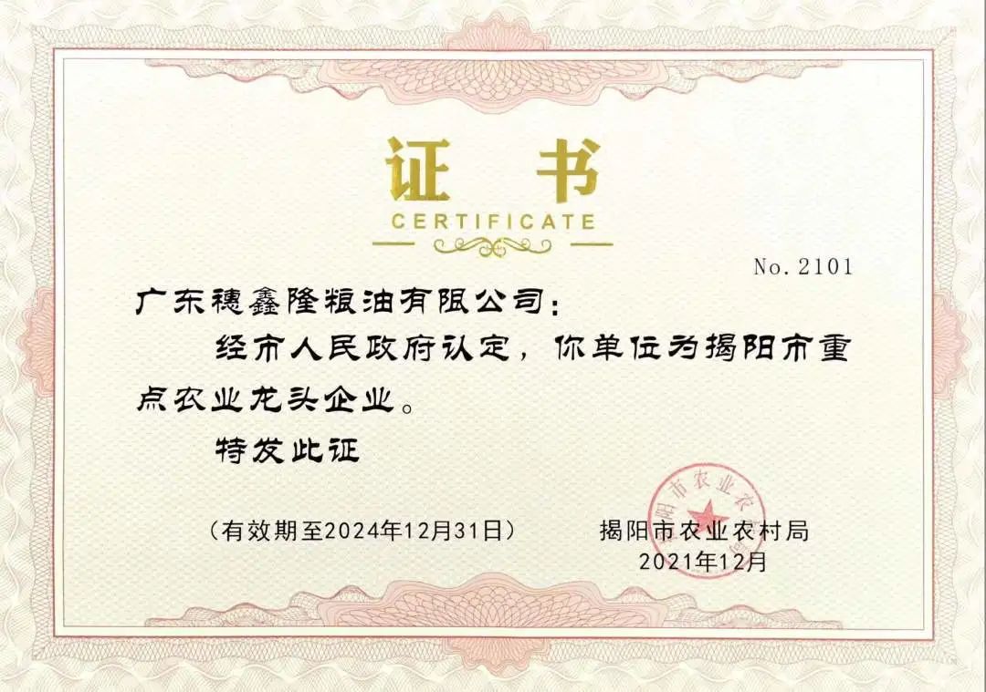 作为揭阳市粮食和物资储备局粮食应急保障企业,穗鑫隆获得市粮食和物资储备局颁发粮食收购许可证和仓库备案证,并连续19年被相关部门评为“重合同,守信用”企业,被揭阳市认定为重点农业龙头企业。