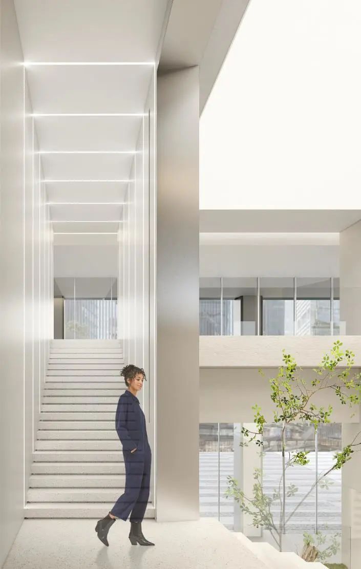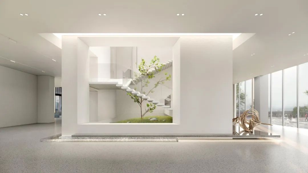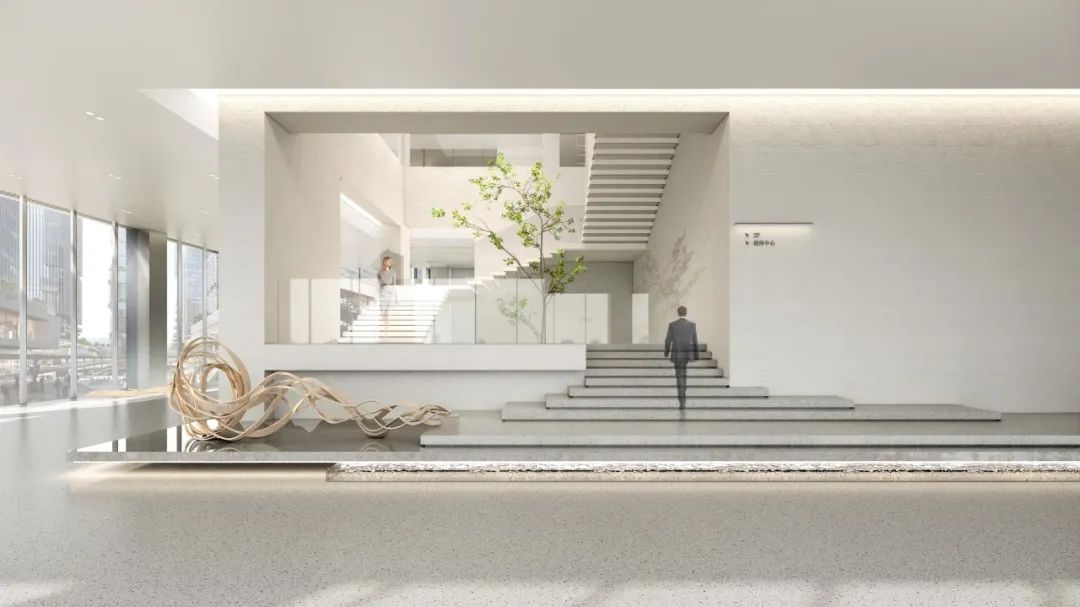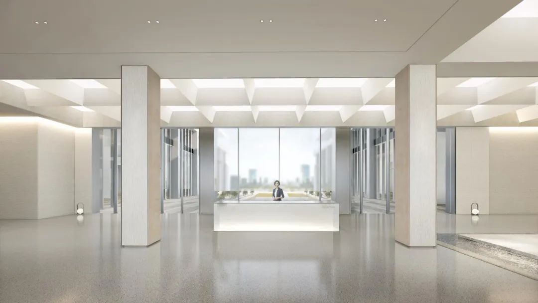 作为建筑和周边环境的延续,大堂的室内设计以简洁轻盈的设计语汇营造文化与艺术氛围,引入更多自然光照明,光影在空间漫步,从而使得大堂空间更为生动。