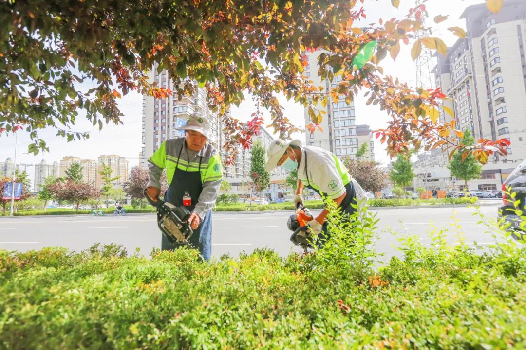 位于石化路西侧的道路绿化带,瀚新园林绿化工人身着统一工作服,手持工具,熟练地对绿植进行养护作业。站在明晃晃的阳光下,他们手持修枝剪为道路绿化带内的绿植进行修形,戴着口罩的脸上不停滚落豆大的汗珠。为了避免晒伤,养护工人都穿着长衣长裤,高温下,淡灰色的工作服被汗水浸染成深灰色,紧紧地粘在了身上。